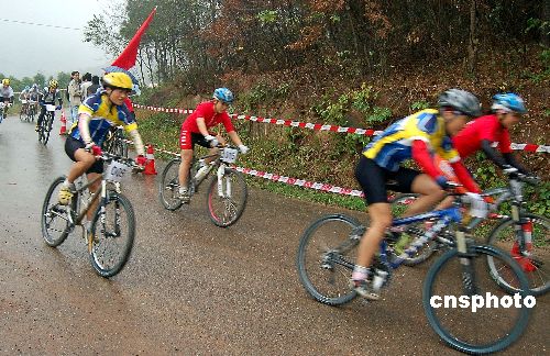 11月22日上午,选手们在安徽省紫蓬山风景名胜区进行13公里越野赛。2006年紫蓬山“中国杯”山地自行车系列赛第五、六站于11月16日、11月22日在紫蓬山举行。中新社发 徐勇 摄