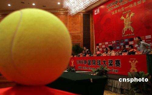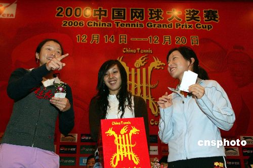 十一月二十七日,中国网球协会、赛事合作伙伴北京比格文化传播有限公司在北京宣布,本年度最后一项中国网坛赛事——二零零六中国网球大奖赛将于十二月在广州举行,包括温网、澳网双打冠军郑洁、晏紫在内的中国网坛顶级选手及众多年轻优秀后备人才将悉数参赛,以检验中国网球后备力量、提高中国网球竞技水平。图为郑洁、晏紫等在发布会上。中新社发 武仲林 摄