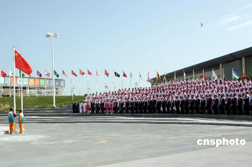 十一月二十九日,参加第十五届亚洲运动会的中国代表团在多哈亚运村内举行升旗仪式。