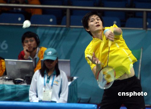 当地时间11月30日上午,多哈亚运会男子羽毛球团体赛在赛场展开,中国男子羽毛球选手鲍春来以2比0胜印度对手KANETKAR Nikhil。中新社发 洪少葵 摄
