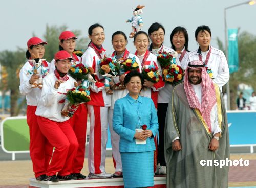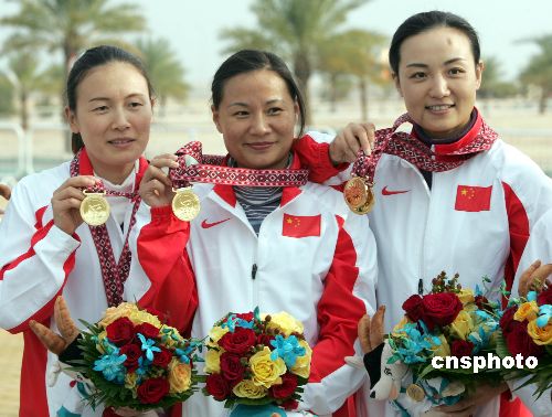 当地时间十二月二日,中国射击队多向飞碟巾帼女将经过了三个多小时的“枪战”,三名中国女将陈丽、朱美和王玉锦打出六十九、六十三、六十三中的成绩,帮助中国队以一百九十五中的总成绩,夺取该项目的团体冠军。中新社发 李刚 摄