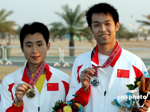 当地三个时间12月2日多哈亚运会举行的男子汽步枪比赛,中国队摘金夺银。图为金牌获得者刘天佑(左)和银牌获得者朱启南。中新社发 李刚 摄