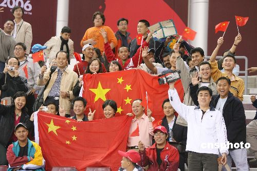 多哈当地时间十二月二日晚,中国男子篮球队在第十五届亚运会上以八十九比七十七战胜哈萨克斯坦队。图为赛场上的中国啦啦队。中新社发 毛建军 摄