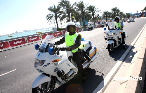 当地时间12月3日上午11时,多哈亚运会男子200公里公路单车赛在风光秀丽的海滨路举行,大批骑警出动为赛事护航。中新社发 洪少葵 摄