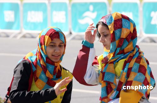 多哈当地时间十二月三日上午,两名女志愿者在第十五届亚运会赛场上交谈。根据主办方公布的数字,本届亚运会有来自七十七个国家的三万名志愿者报名应征,最终组委会从中选出一万六千名志愿者。中新社发 毛建军 摄