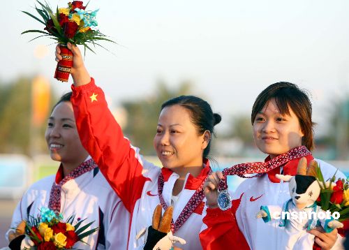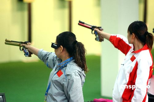 当地时间十二月三日,参加第十五届亚运会10米气手枪决赛的陶璐娜(左)以490.3环的总成绩轻松夺冠,这也是中国射击队在本次亚运会上收获的第10枚金牌,是中国军团于多哈的第21枚金牌。郭文珺获得10米气手枪银牌。中新社发 廖文静 摄