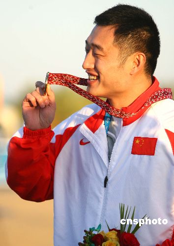 十二月三日,第十五届亚洲运动会男子十米气手枪决赛中谭宗亮一举夺冠,在颁奖仪式上谭宗亮手持金牌喜不自禁。中新社发 廖文静 摄
