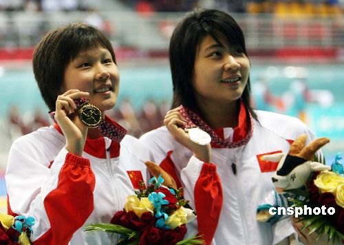 当地时间12月4日晚,卡塔尔哈马德水上中心开始了第15届亚运会游泳比赛第三天的金牌大战。在女子50米仰泳决赛中,中国选手赵菁和高畅发挥出色,以28秒69和28秒88包揽冠亚军。中新社发 洪少葵 摄