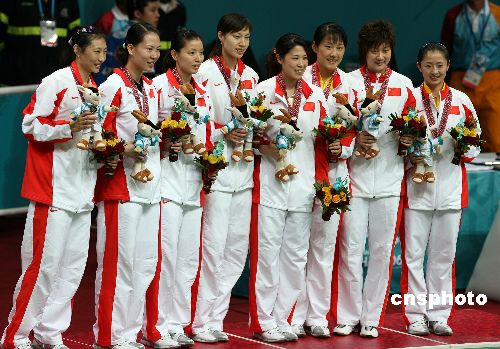 多哈当地时间十二月五日晚,中国女子羽毛球队在第十五届亚运会羽毛球团体决赛中以三比零战胜日本队获得冠军。中新社发 毛建军 摄