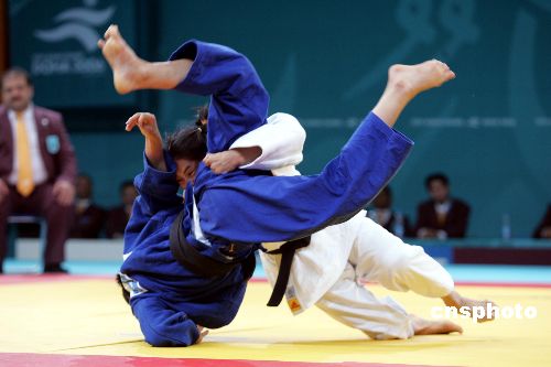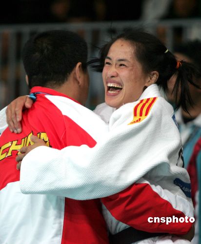 当地时间12月5日,中国运动员高峰夺得多哈亚运会女子柔道48公斤以下级金牌。高峰赛后激动地和教练拥抱。中新社发 李刚 摄