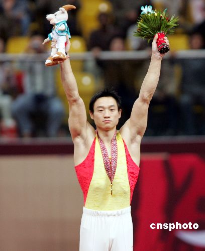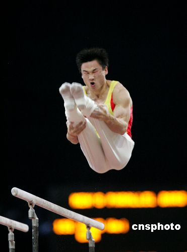 当地时间12月6日晚,中国体操队员杨威在男子双杠比赛中获得金牌。至此,杨威在本届亚运会上参加的六个项目的比赛中,拿到了四块金牌。中新社发 李刚 摄