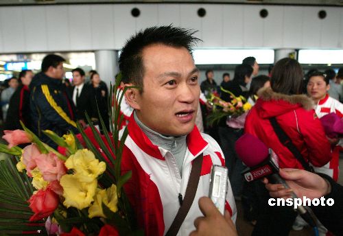 十二月七日,参加第十五届亚运会的中国举重队从多哈返回北京,张国政在机场接受媒体采访。本届亚运会上,中国举重队以十金四银的骄人战绩显示了他们在亚洲的绝对优势。中新社发 杜洋 摄