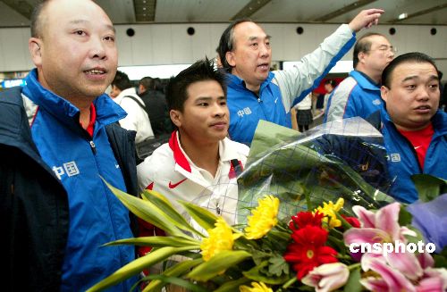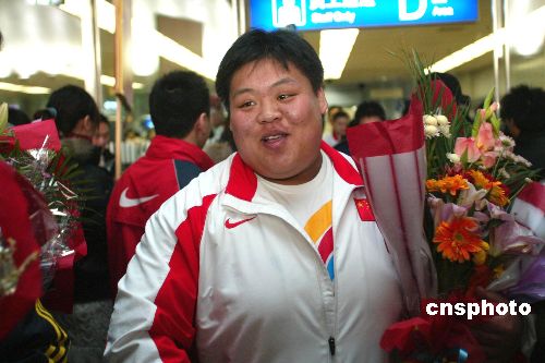 十二月七日下午,结束了第十五届多哈亚运会赛事的中国国家举重、柔道、射击等队队员及教练员抵达北京首都机场。中新社发 杜洋 摄