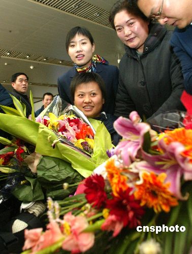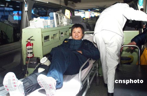 十二月七日,参加第十五届亚运会的中国举重队从多哈返回北京,在比赛中受伤的欧阳晓芳甫抵首都机场即被送上救护车,前往医院治疗。欧阳晓芳是在比赛进行到第二次挺举时受伤的,但她仍凭借第一次挺举成绩夺得银牌,并以一百一十五公斤抓举的成绩平了白俄罗斯选手创造的世界纪录。受伤后她经医院诊断为右膝关节十字韧带和内侧副韧带断裂,手术后韧带恢复正常需要八个月到一年。中新社发 杜洋 摄