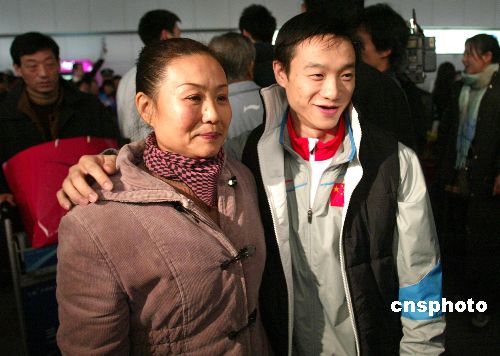 十二月八日下午,结束了第十五届多哈亚运会赛事的国家体操队队员及教练员返回北京。在本届亚运会中独得四枚金牌的体操选手杨威在首都机场与母亲相拥。中国体操队在本届亚运会上独揽十一金捍卫了体操霸主的地位。中新社发 杜洋 摄