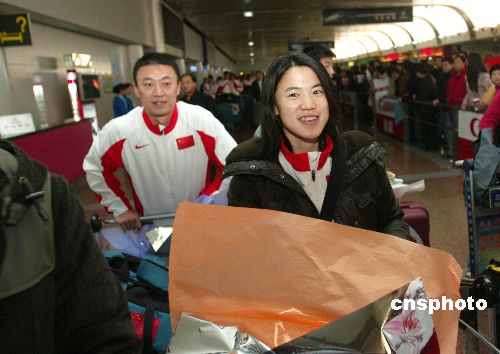 十二月八日下午,结束了第十五届多哈亚运会赛事的国家乒乓球队队员及教练员返回北京。多哈亚运会乒乓球项目全部的七枚金牌中有六枚被中国队收入囊中,尽管男双失守,但是仍然可以说中国乒乓球项目在多哈取得了圆满的胜利。图为获得混双冠军的王楠和马琳一起走出首都机场。中新社发 杜洋 摄