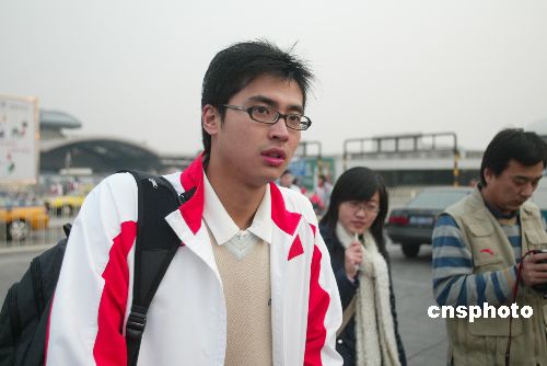 十二月八日下午,结束了第十五届多哈亚运会赛事的国家游泳队队员吴鹏返回北京。吴鹏在男子二百米蝶泳中游出了今年世界第二好成绩,仅次于美国金童菲尔普斯。中新社发 杜洋 摄