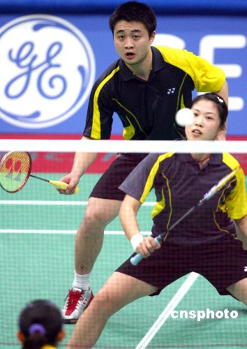 当地时间十二月八日晚,多哈亚运会羽毛球混双决赛中,中国选手高崚/郑波夺得金牌,另一对中国选手谢中博/张亚雯获得亚军。中新社发 廖文静 摄
