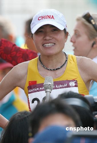 多哈当地时间十二月九日中午,中国女子马拉松选手周春秀在第十五届亚运会马拉松比赛中,以二小时二十七分零三秒的成绩获得冠军。中新社发 毛建军 摄