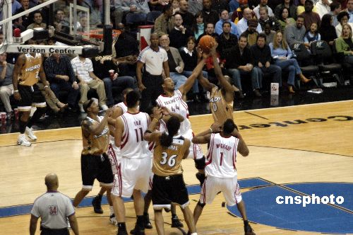 在美国华盛顿特区Verizon中心,NBA06/07年赛十二月九日晚休斯敦火箭队114比109赢华盛顿奇才队,场上拼抢激烈,比分屡屡平局,场上观众清一色是奇才队的球迷,姚明等火箭队球星火爆反击,最终以小的优势赢得客场的比赛。中新社发 邱江波 摄