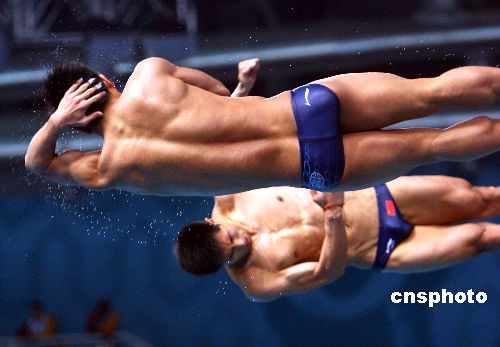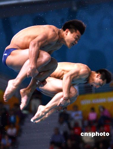 当地时间十二月十日晚,在多哈亚运会男子双人三米板跳水比赛中,中国选手王峰、何冲获得金牌。中新社发 廖文静 摄