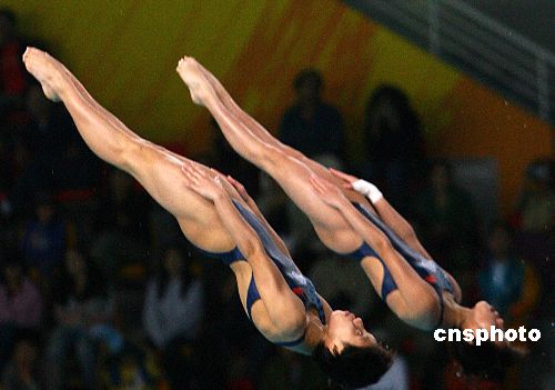 当地时间十二月十日晚,在多哈亚运会女子双人十米跳台比赛中,中国选手贾童/陈若琳夺得金牌。中新社发 廖文静 摄