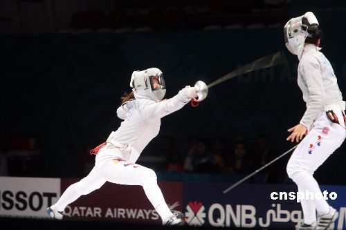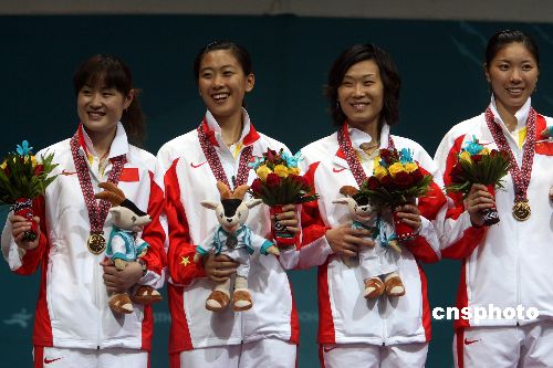 当地时间12月12日,中国选手谭雪、赵媛媛、黄海洋、张莹赢得多哈亚运会击剑女子佩剑团体金牌。中新社发 洪少葵 摄