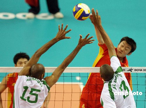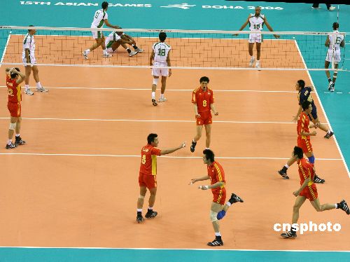 多哈当地时间十二月十三日下午,中国男排在多哈亚运会男子排球半决赛中,以三比二险胜沙特队挺进决赛。中新社发 毛建军 摄