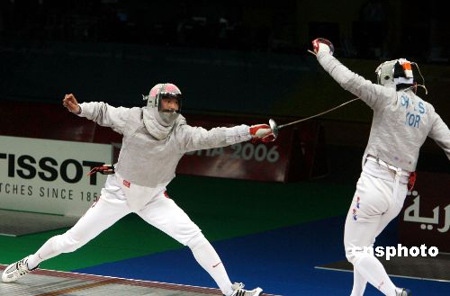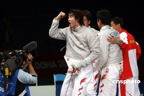 当地时间12月13日晚,中国击剑队在多哈亚运会男子重剑团体赛上击败韩国队,夺得金牌。图为王敬之与队员高呼胜利。中新社发 洪少葵 摄