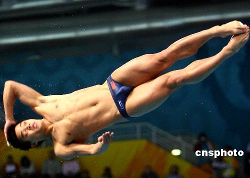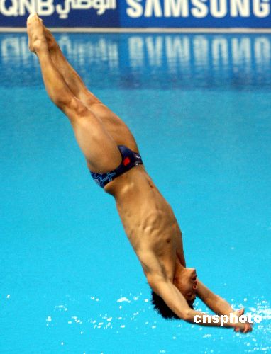 当地时间十二月十三日晚,多哈亚运会跳水男子单人三米板决赛中,中国选手何冲以530.40 分夺得冠军。中新社发 廖文静 摄