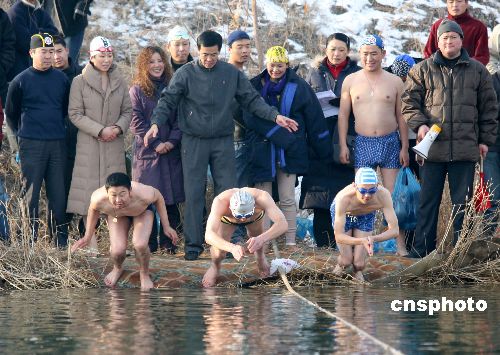 2006年12月27日,新疆伊宁市举行第二届冰雪旅游节冬泳比赛,28名选手冒着零下8摄氏度的低温跃入水中,劈波斩浪,奋勇争先。他们挑战自我的勇气,赢得现场观众的阵阵喝彩。中新社发 留光驻影 摄