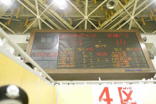2007年1月3日,CBA第17轮江苏南钢和新疆广汇的比赛进行中,由于显示屏出故障,第一节开场6分多钟,显示出江苏以“51:10”获胜,令全场愕然。中新社发 吴俊 摄