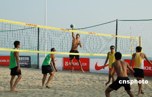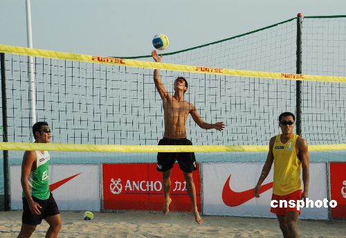 一月九日,中国沙滩排球队队员在八日揭牌落成的中国沙滩排球队三亚训练基地训练。为备战二00八年北京奥运会,八名女选手和六名男选手将在三亚进行为期六十天的系统训练。中新社发 尹海明 摄