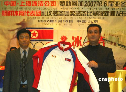 1月16日,中国上海冰洁服饰公司赞助朝鲜体育代表团参加2007年第6届亚洲冬季运动会比赛服装等装备仪式在北京举行。该运动会将于1月底在中国吉林省举行,朝鲜将派出150人的代表团参加冰球、速度滑冰、越野滑雪等项目。中新社发 赵振清 摄