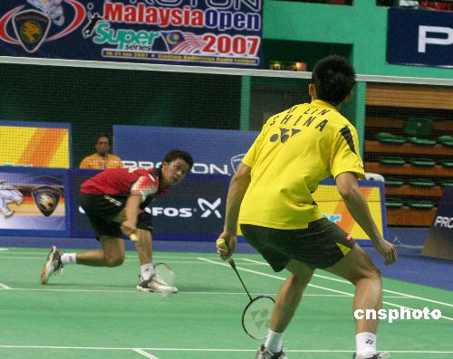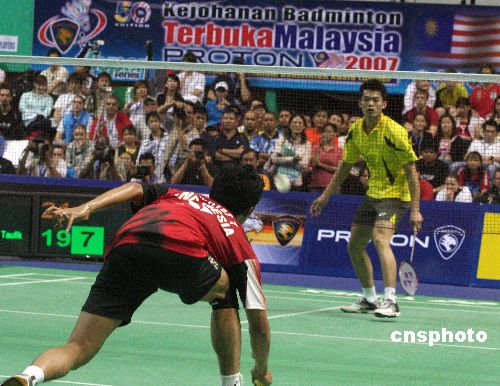 一月十七日晚,大马羽毛球公开赛进行一场焦点战,世界冠军、中国的林丹(黄衣者)淘汰奥运冠军、印尼名将陶菲克,比分为二十一比十九、二十三比二十一。中新社发 苏祥新 摄