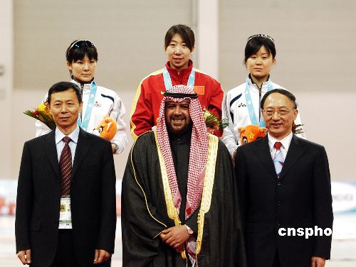 一月二十九日,中国选手王霏夺得亚冬会首金,亚奥会主席艾哈迈德亲王、中国体育总局局长刘鹏等为其颁奖。中新社发 廖攀 摄
