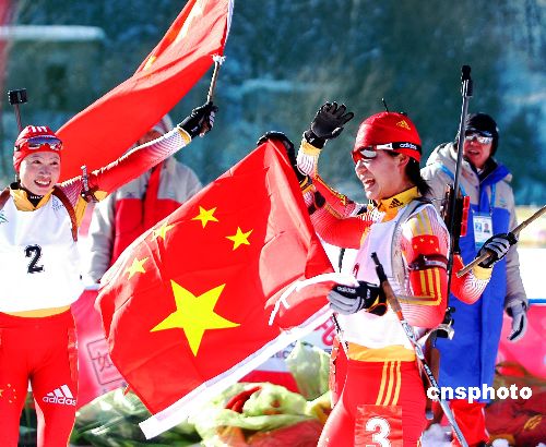 1月30日,第六届亚冬会冬季两项女子10公里追逐赛决赛在吉林北大湖滑雪场结束争夺,孔颖超以36分13秒93的成绩成功卫冕,为中国代表团拿下本届亚冬赛的第四枚金牌,刘显英和董雪分别摘得银牌和铜牌。中新社发 廖攀 摄