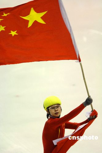 1月30日,长春亚冬会短道速滑女子500米A组决赛中,王濛摘得金牌,成绩为43秒869。赛后王濛举起国旗向观众示意。29日,女子1500米的比赛中王濛遭韩国选手阻挡未能超越成功,痛失金牌。中新社发 廖攀 摄
