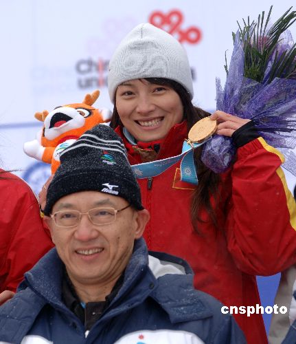 1月31日上午,国家体育总局局长刘鹏为第六届亚冬会自由式滑雪女子空中技巧比赛颁奖。刘鹏关切地叮嘱李妮娜说:“天气不是很理想,要注意安全!”中新社发 廖攀 摄