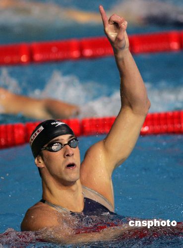 3月27日晚,第十二届世界游泳锦标赛男子200米自由泳决赛在澳大利亚墨尔本举行,赛前声称将夺取所有参赛项目金牌的美国巨星菲尔普斯(PHELPS Michael)以1分43秒86的成绩打破世界纪录勇夺金牌。中新社发 任晨鸣 摄