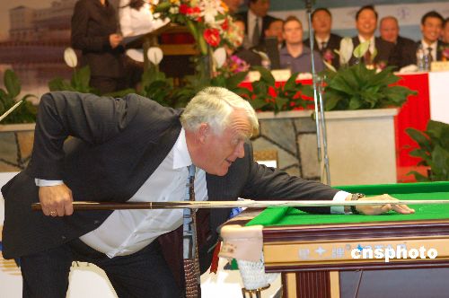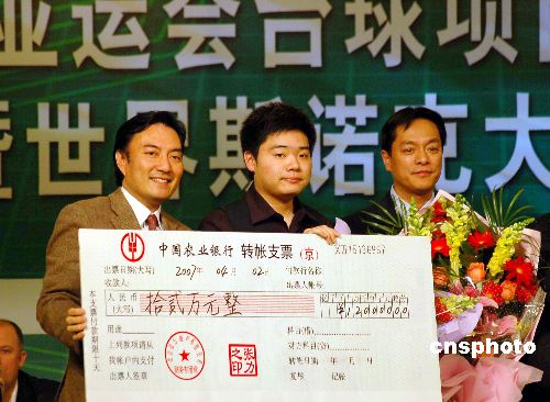 4月2日晚,在“亚运会台球项目金牌得主庆功会暨世界斯诺克大师表演赛”上,亚运会台球冠军丁俊晖获得奖杯和奖金,并与刚刚获得2007年世界斯诺克中国公开赛冠军多特、亚军柯普分别进行一场三局的表演赛。中新社发 潘旭临 摄