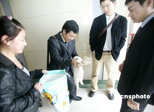 4月3日,丁俊晖在江苏南京获授“江苏十佳运动员”称号。由于4月2日在北京的比赛很晚才结束,丁俊晖4月3日晨飞抵南京。在颁奖现场场外,一位“粉丝”送给丁俊晖一只宠物狗,使他意外惊喜,他看上去并不疲惫。中新社发 吴俊 摄