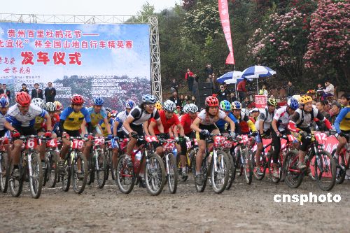 2007年4月6日,贵州百里杜鹃花节--“湖北宜化”杯全国山地自行车精英赛开赛,并决出男子专业组、女子专业组和男、女业余组四枚金牌。山东的刘一霖,江苏的王静静分获男女专业组第一名,男女业余组均由四川队获得,分别是田海滨、周华。贵州遵义的刘琼获得女子业余组第二名。中新社发 章静 摄