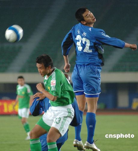以原北京国安队员(绿)为主要成员的厦门蓝狮队(蓝)四月八日晚在厦门主场一比二不敌北京国安队。中新社发 郑祚声 摄