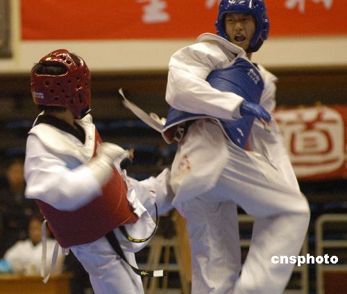 4月16日,安徽队闫岩获2007年全国跆拳道锦标赛男子67公斤级冠军。2007年全国跆拳道锦标赛暨北京奥运会选拔赛在山西省晋城市举行。中新社发 袁文中 摄