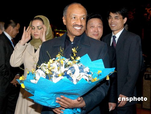 2007年4月19日晚,亚足联主席哈曼姆受到热烈欢迎。参加亚足联“中国展望”计划南京项目启动仪式暨南京城市联赛开幕式的国际足联执委、亚足联主席哈曼姆等亚足联官员一行,乘专机抵达南京。中新社发 刘建民 摄