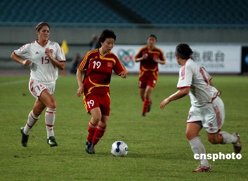 2007年5月3日,中国国家女子足球队在南京以3比1击败加拿大国家女子足球队,取得热身赛的首场胜利。中新社发 刘建民 摄