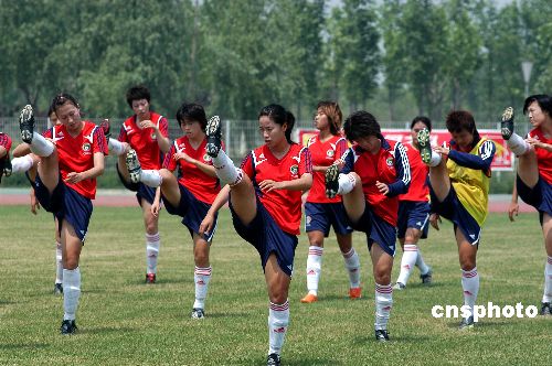 2007年5月5日,中国女子足球队在南京奥体中心体育场外场训练,准备再战加拿大国家女子足球队。中新社发 刘建民 摄