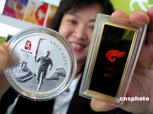 5月9日,青岛市一家金币公司的工作人员正在展示奥运火炬接力纪念章。据介绍,该系列纪念章分金银两种,由北京奥组委授权中国金币总公司发行。金、银纪念章规格最大的有一公斤重,一公斤重的金制纪念章全国限量发行68枚,银制纪念章限量发行2008枚。金币正面是手持火炬奔跑的运动员,反面是第29届奥运会火炬的传递标识。同时发行的还有第三组奥运金条,该金条全国限量发行1750公斤,从1000克至100克不等,100克金条的价格为20800元。中新社发 赵健鹏 摄