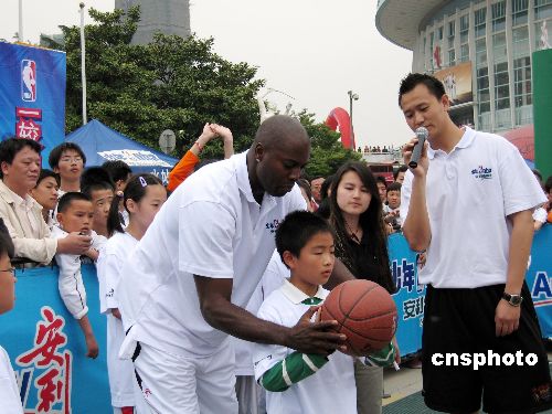 NBA传奇球星,一九九七年NBA全明星赛最有价值球员及二000年NBA总冠军洛杉矶湖人主力队员格伦·莱斯,5月12日,在上海八万人体育馆出席由安利纽崔莱特约赞助的“少年NBA技术挑战赛二00七”活动。格伦·莱斯在现场为上海的少年篮球选手示范指导篮球基本技巧。中新社发 刘立涛 摄